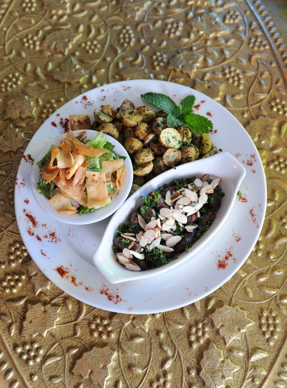 Fattush. Ensalada verde –pepino, tomate, cebolla roja, rábano, chile dulce, yerbabuena– y trocitos de pan pita fritos, aceite de oliva y sumac (especia de la familia del anacardo). Abundante y muy sabrosa. Pareciera inacabable, pero combina tan bien con los platos fuertes que acompaña, que pronto desaparece del plato.
