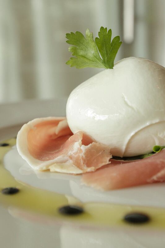 Mozarella di bufala e prosciutto. Sobre lechuga, con pluma de hoja de apio. Emplatado lucido, con el prosciutto rodeando al queso. Combinación deliciosa.