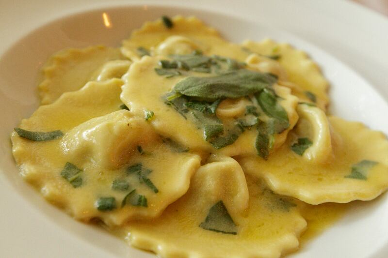 Ravioli d’agnello. Ravioli rellenos con carne de cordero, en salsa de mantequilla y salvia. Buenísimos.