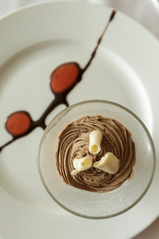Mousse al cioccolato. Con colochitos de chocolate blanco encima. Aterciopelado y con el dulzor justo.