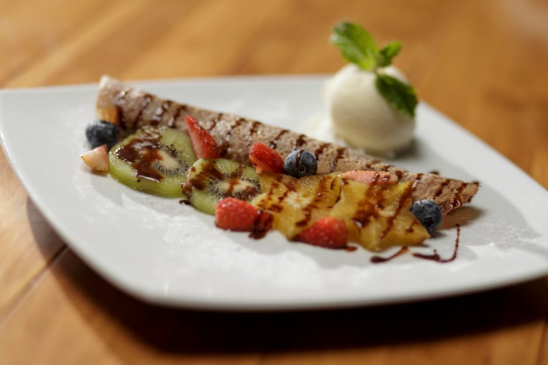 Crepas con nutella. El relleno estaba un poco desproporcionado a favor de la crema chantilly que le competía a la nutella . Las frutas que lo acompañaban no terminaban de integrarse al plato, especialmente el kiwi, que se sentía demasiado maduro. La carambola, por excepción, si parece un elemento acertado.