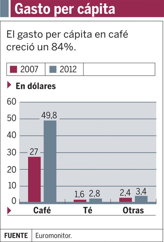 Los datos de Euromonitor indican que el gasto per cápita en todo tipo de bebidas calientes se incrementó, pero mayoritariamente el del café. El número no implica, necesariamente, un incremento en el precio, pero puede ser un factor.