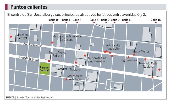 Otro detalle curioso tiene que ver la identificación de los lugares más importantes para el turismo en San José centro. Además de los hoteles, el estudio señala un área muy pequeña integrada básicamente por museos, mercados de artesanía, Teatro Nacional, pequeñas tiendas y café.