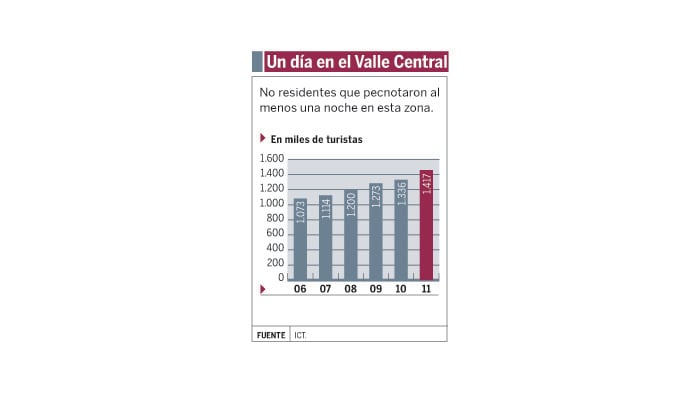 De hecho, la entidad reportó que para el 2011 el 49 % de los turistas que se quedaron en el Valle Central lo hizo por motivos de negocio, el 40% por vacaciones y ocio y un 2% por salud.