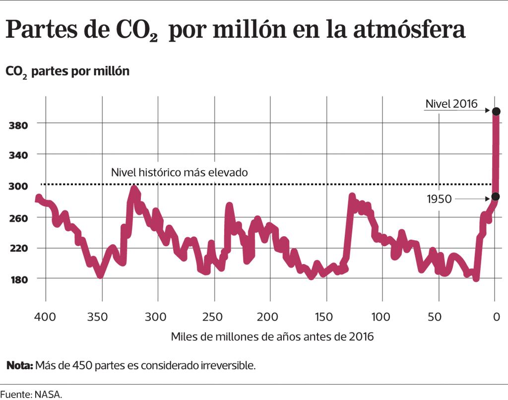 Pero como el naturalista Bill McKibben señala en un artículo en el New York Times el 1.° de junio: “Hemos visto en 2014 un nuevo récord global de temperatura, que fue superado en 2015 y de nuevo en 2016. Hemos observado la desaparición del hielo en el Mar Ártico a un ritmo récord y también la desintegración de las grandes capas de hielo de Antártida. Se han registrado aumentos alarmantes de sequías, de inundaciones y de incendios forestales, y se ha podido relacionar esas calamidades directamente con los gases de invernadero que hemos enviado a la atmósfera”.