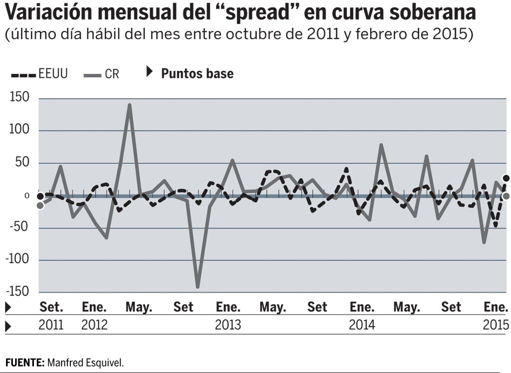 La volatilidad del spread en la curva soberana de Costa Rica es muy alta como para que este sea considerado un buen indicador de expectativas. El gráfico adjunto muestra la evolución en el tiempo del cambio mensual en el spread de la curva soberana de Costa Rica y la de los bonos del Tesoro de EE. UU. Si el spread en Costa Rica fuese un buen indicador, entonces las expectativas sobre tasa de interés son sumamente erráticas y volátiles, cosa que no es esperable. El valor absoluto promedio de la serie de Costa Rica es casi dos veces mayor que la de EE. UU. (29,3 vs. 15,3 puntos).