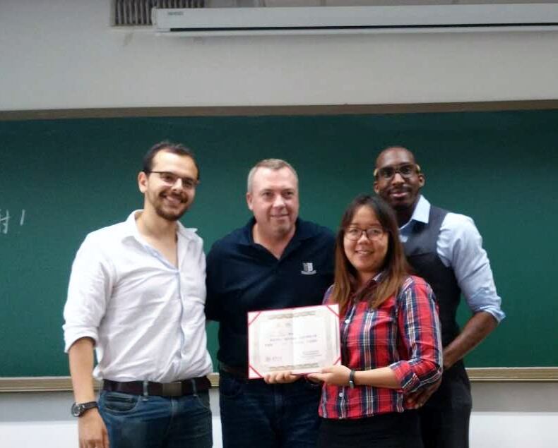 El costarricense Ricardo Chacón, junto a Allen Nichols, quien fue juez en la competencia realizada en Beijing, China, y sus compañeros de equipo Obichukwu Udeh, de Estados Unidos, y Waynika Tanpipat, de Tailandia. (Ricardo Chacón para EF)