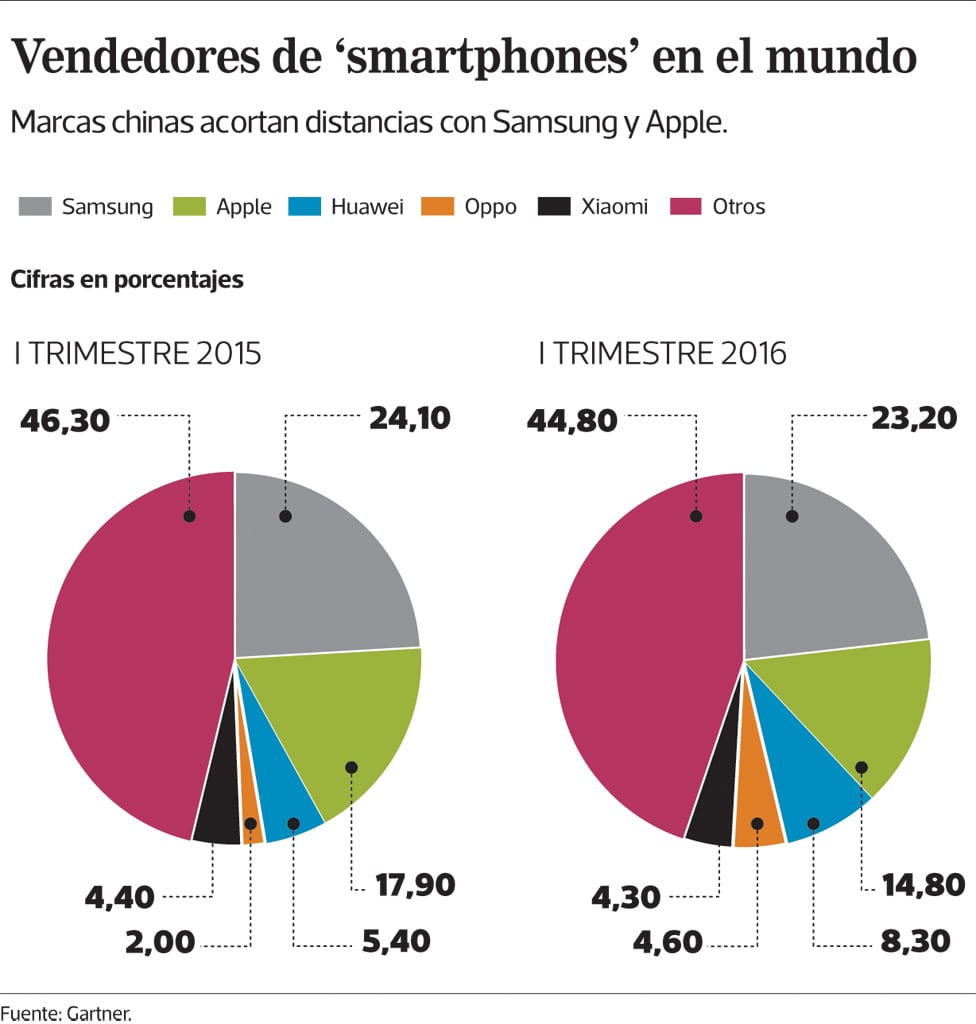 “Con este tipo de dinámica dentro del mercado de teléfonos inteligentes, las firmas chinas se están convirtiendo en las nuevas mejores marcas globales. En el primer trimestre del 2016, había tres marcas chinas: Huawei, Oppo y Xiaomi, que acumularon el 17% del mercado”, detalló Anshul Gupta, director de investigación de Gartner, en el reporte de la compañía.