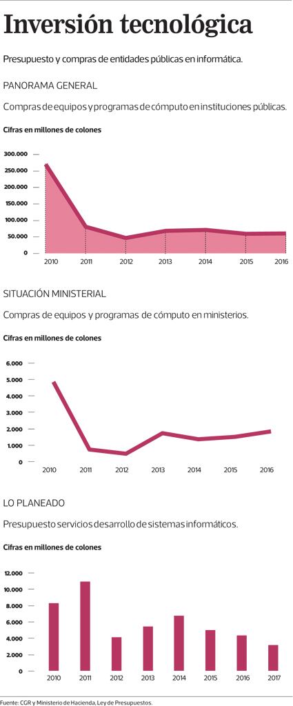 Así en el 2010 las compras de tecnología de todas las instituciones sumaron ¢270.089 millones. Para el 2016, el rubro cayó casi cinco veces a ¢60.224 millones.