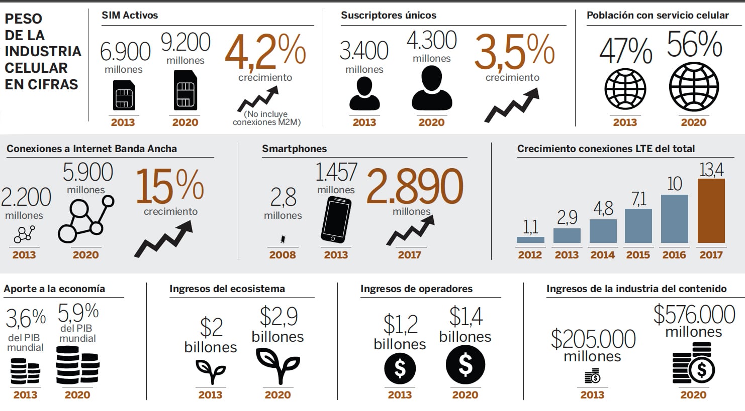 Es un mercado boyante. En el 2013, 11,3 billones de dispositivos estaban conectados y se duplicarán en el 2020 a unos 25,7 billones de aparatos conectados, según el informe de GSMA Intelligence sobre la Economía Móvil 2014.