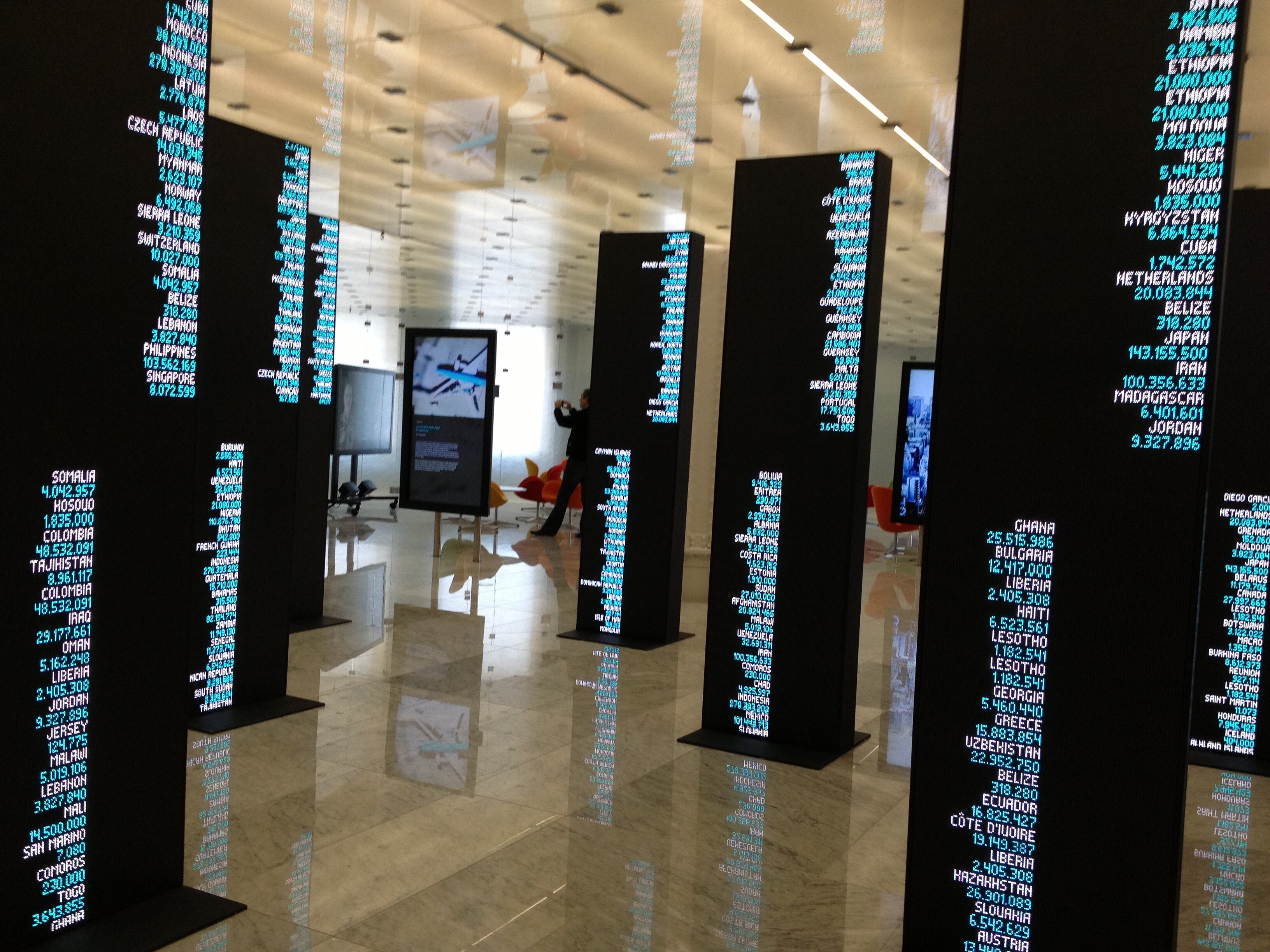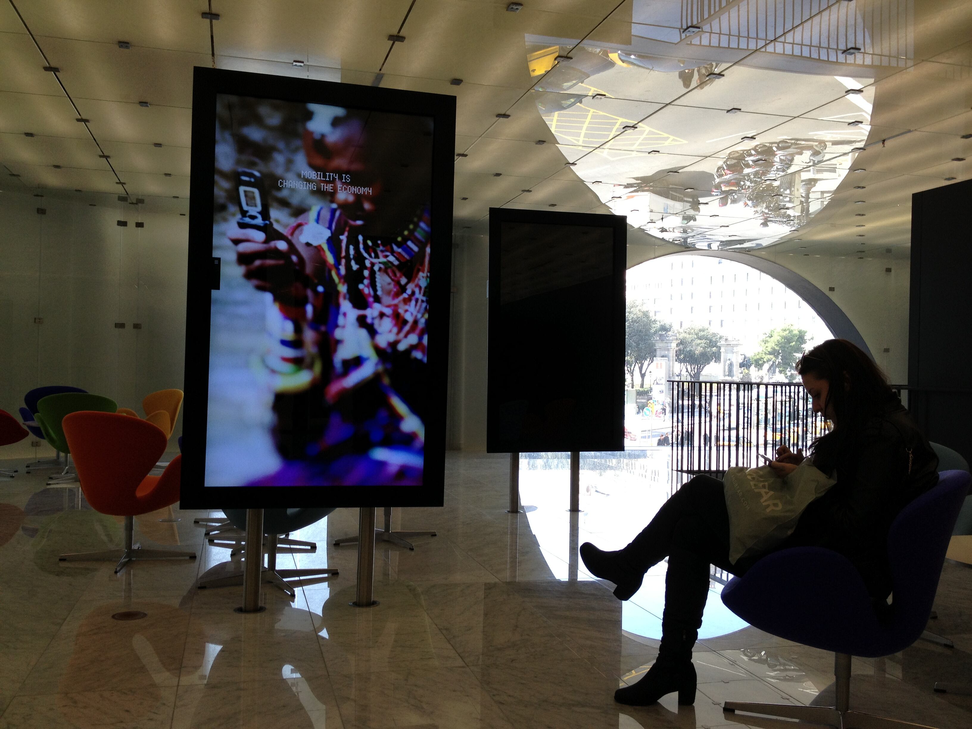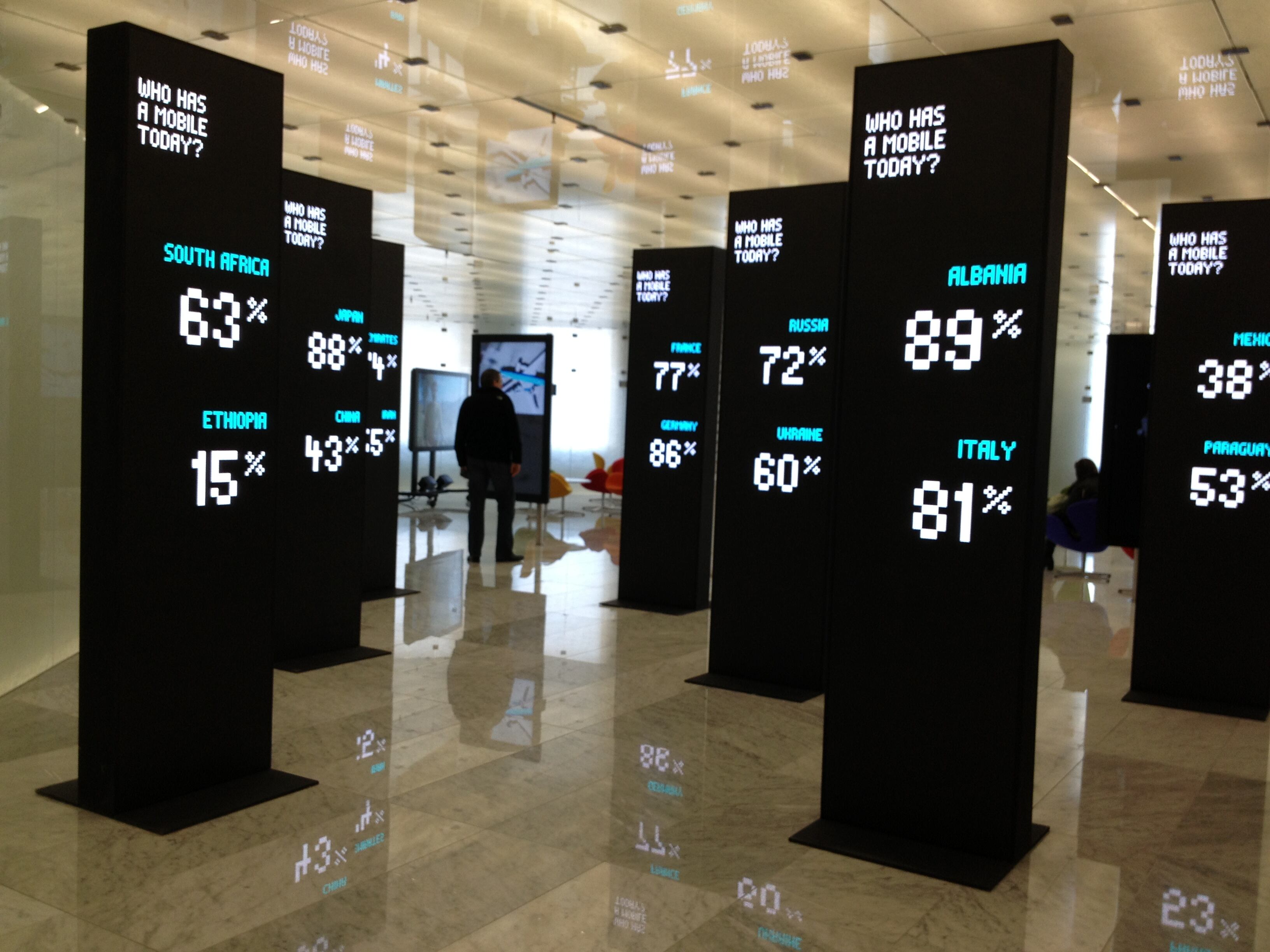En el Mobile World Center de Barcelona pantallas gigantes muestran estadísticas actualizadas sobre penetración de las tecnologías móviles en el mundo. (Mónica Cordero Sancho)