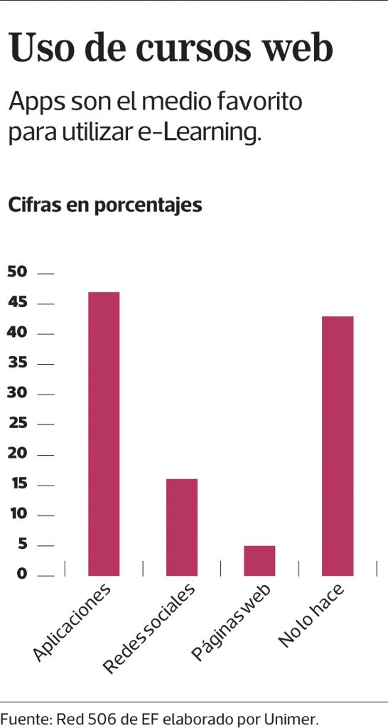Datos del estudio Red 506 elaborado por Unimer para EF mostró que un 47% dijo usar la web para tomar cursos en línea por medio de aplicaciones, 16% en redes sociales y tan solo un 5% lo hace por páginas web.