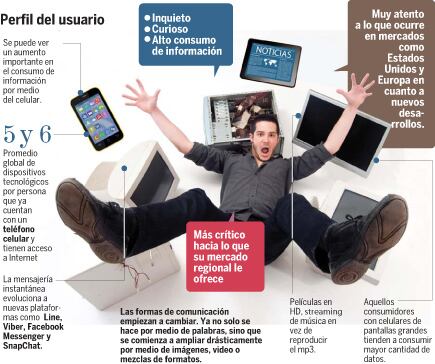 El usuario de esta tecnología se describe hoy como inquieto, curioso y con un alto consumo de información. Es crítico hacia lo que su mercado regional le ofrece y muy atento a lo que ocurre en mercados como Estados Unidos y Europa, explica Israel Tejada, jefe de estrategia digital para Clandestina Hub Creativo.