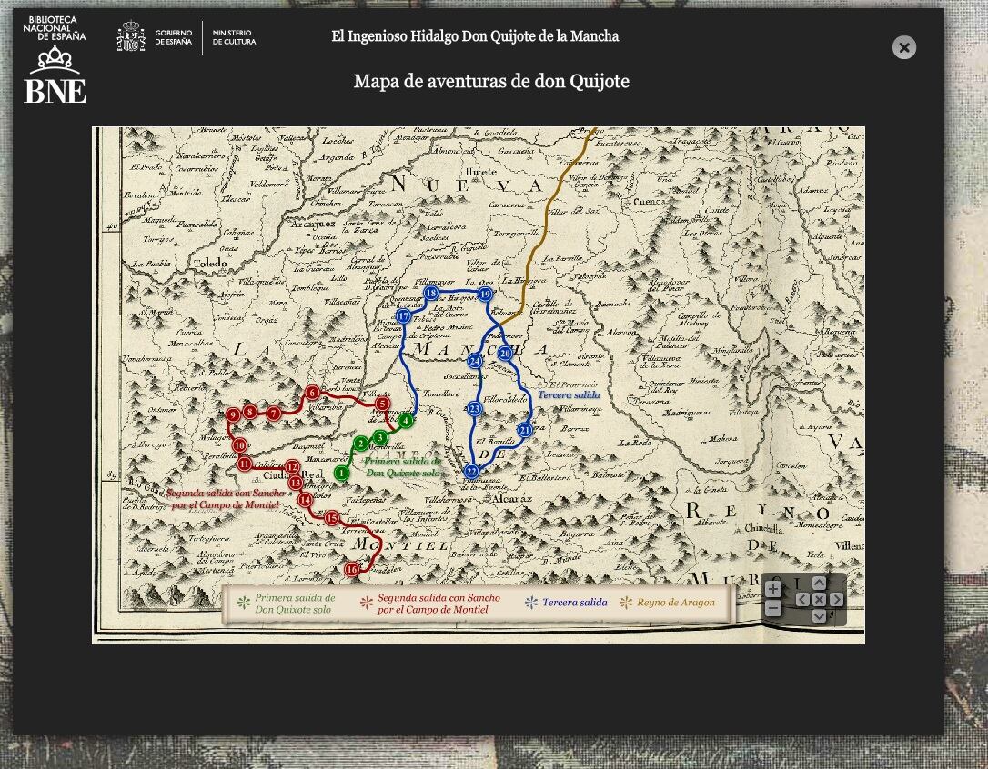 Desde mapas con las rutas de las aventuras hechas por don Quijote hasta grabados y otros contenidos procedentes de 43 ediciones distintas de la obra de Miguel de Cervantes se pueden encontrar en el Quijote interactivo .