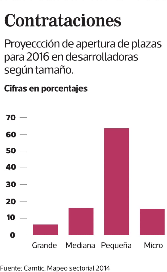 De acuerdo con el “Mapeo sectorial de tecnologías digitales 2014”, de Camtic, que registró datos de 219 firmas, las pequeñas desarrolladoras (de 6 a 30 empleados) eran las que proyectaban más contrataciones en el 2016.