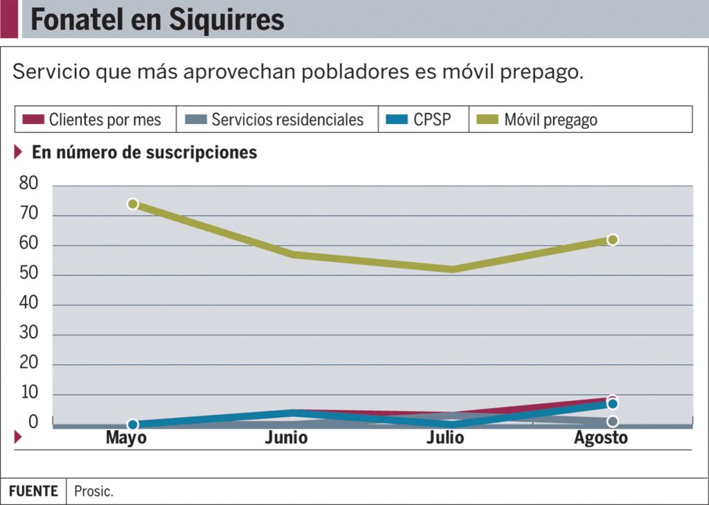 Según el cartel de licitación del proyecto de Fonatel en Siquirres, que costó $393.244, 1.140 viviendas resultarían impactadas con Internet y telefonía fija, indica el informe de Prosic. A agosto del 2014, solo se habían suscrito un 0,35% de las familias.