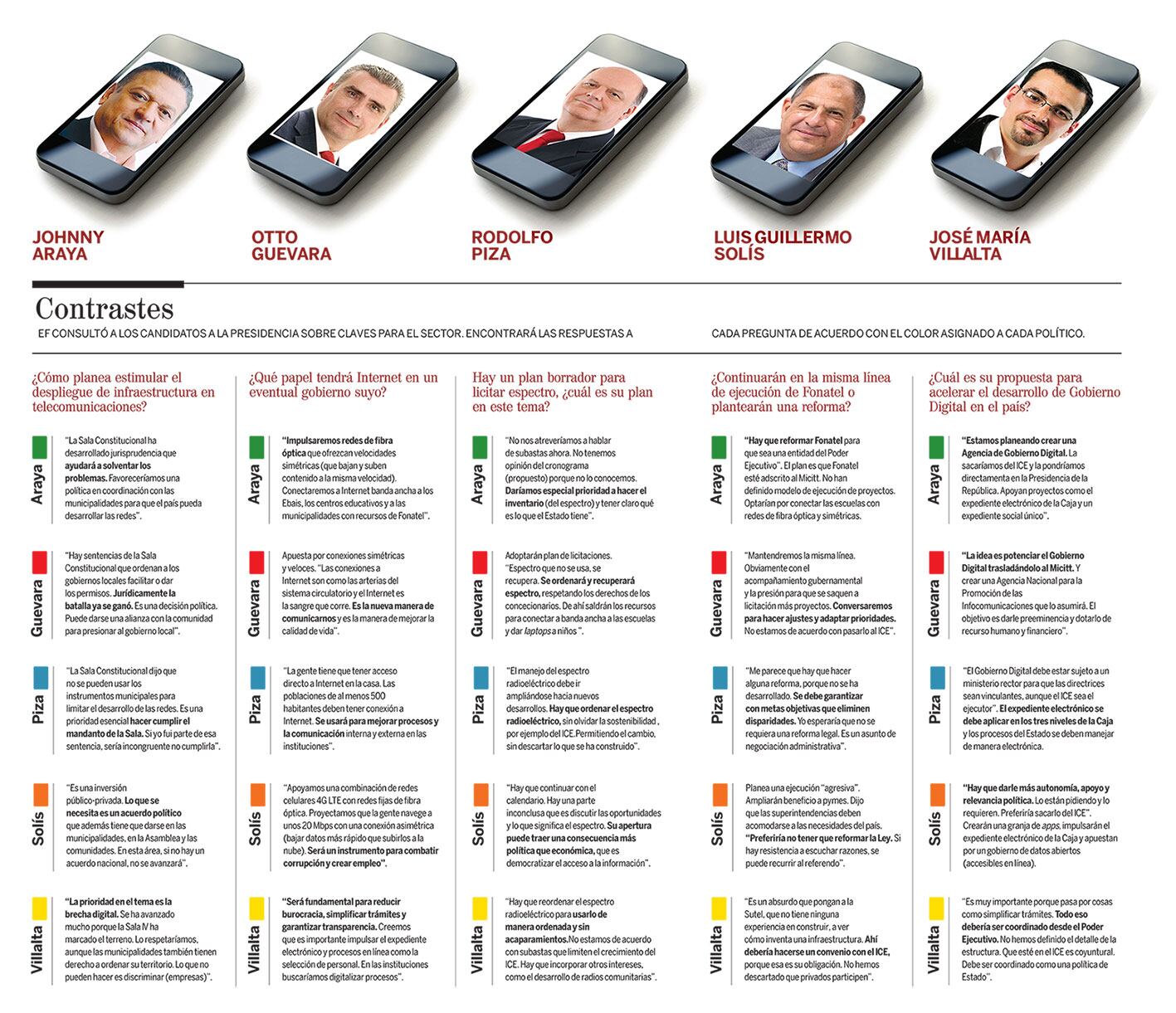 Frente Amplio: Proponen reformar la Constitución Política para que el acceso a Internet y las TIC se conviertan en un derecho fundamental. Promoverán el uso del expediente electrónico en la Caja y de un sistema electrónico de compras públicas (eficiente y poco costoso). Trasladarán el 40% de los recursos de Fonatel cada año al MEP. El objetivo es extender el uso de Internet banda ancha a todos los centros educativos, con proyectos ejecutados por el ICE. En el capítulo de Telecomunicaciones, se planea despolitizar la administración del ICE al sustituir, por ejemplo, la presidencia por una gerencia y crear perfiles de los puestos. Reformarán la Ley General de Telecomunicaciones para restablecer el carácter público de los servicios. Abrirán a debate nacional el tema de las concesiones de radio y TV para mayor pluralidad.