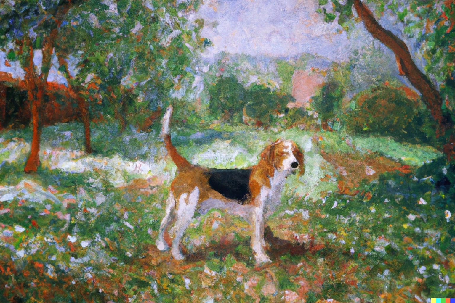 Además, no solo es capaz de comprender esas formas sino también los estilos. Este es el resultado si le pido el beagle en el parque de día pintado en el estilo Claude Monet: