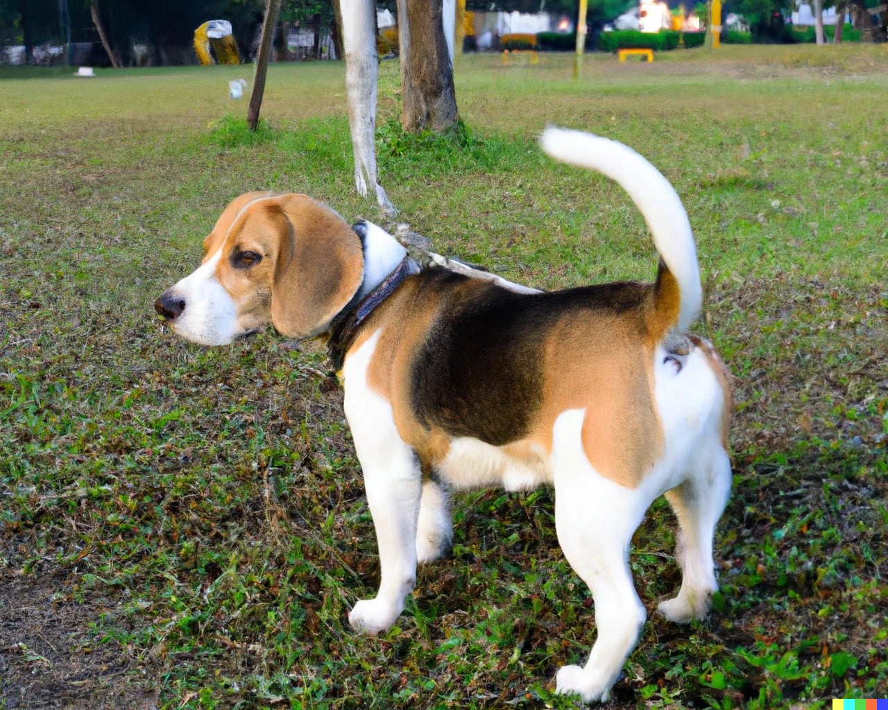Pongamos un ejemplo: si yo le pido a Dall-E que me haga un beagle en un parque de día, me hará la siguiente imagen (la cual es única a mi búsqueda y si se la vuelvo a pedir después me hará una diferente):