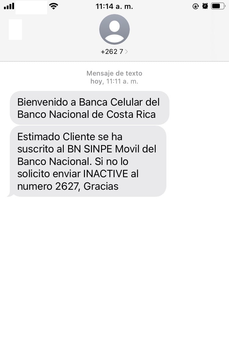 En ese nuevo SMS me comunican que me suscribieron al servicio de Sinpe.