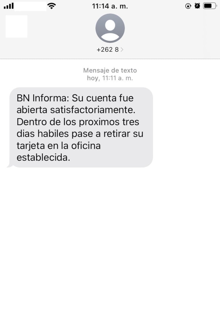 No me había terminado de ubicar en el escritorio, cuando en mi celular y en el reloj llegó una notificación de un mensaje que me dejó casi helado y atarantado, sin saber para dónde agarrar o qué hacer. Era un mensaje corto de texto (SMS) que decía: “BN informa: su cuenta fue abierta satisfactoriamente”.
