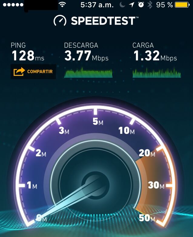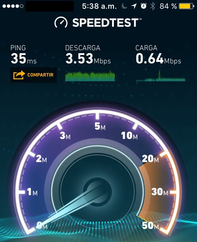 Revisé redes sociales, publiqué algo en Twitter alusivo a la falta de presas y la conexión wifi (tenía mucho entusiasmo de ambos sueños hechos realidad, aunque fuera por un instante) y le realicé una prueba de velocidad con la aplicación de SpeedTest.