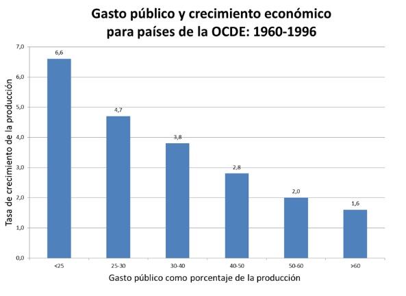 La evidencia confirma que, a mayor gasto público, menor es la tasa de crecimiento y mayor es la tasa de desempleo. Uno de estos estudios es “The Size and Functions of Government and Economic Growth”, donde muestran cifras comparativas que van desde 1960 hasta 1996 para los países miembros de la Organización para la Cooperación y el Desarrollo Económicos (OCDE). En este estudio se concluye que existe una relación negativa entre crecimiento del gasto público como porcentaje de la producción nacional y las tasas de crecimiento de la economía.