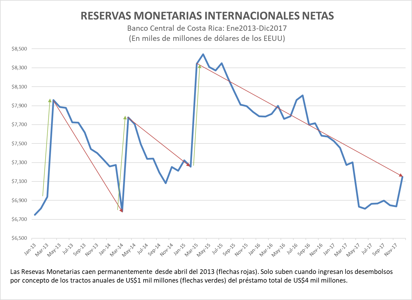 Pues bien, si el monto de las RMI cae es porque la demanda global de dólares es mayor a la oferta global y reflejaría que el mercado está presionando a una depreciación. En el portal de la Internet del BCCR observamos que las RMI han venido cayendo durante toda la Administración Solís Rivera. A diciembre del 2015, 2016 y 2017 sumaban, respectivamente, $7.834; $7.573; y $7.149 millones.