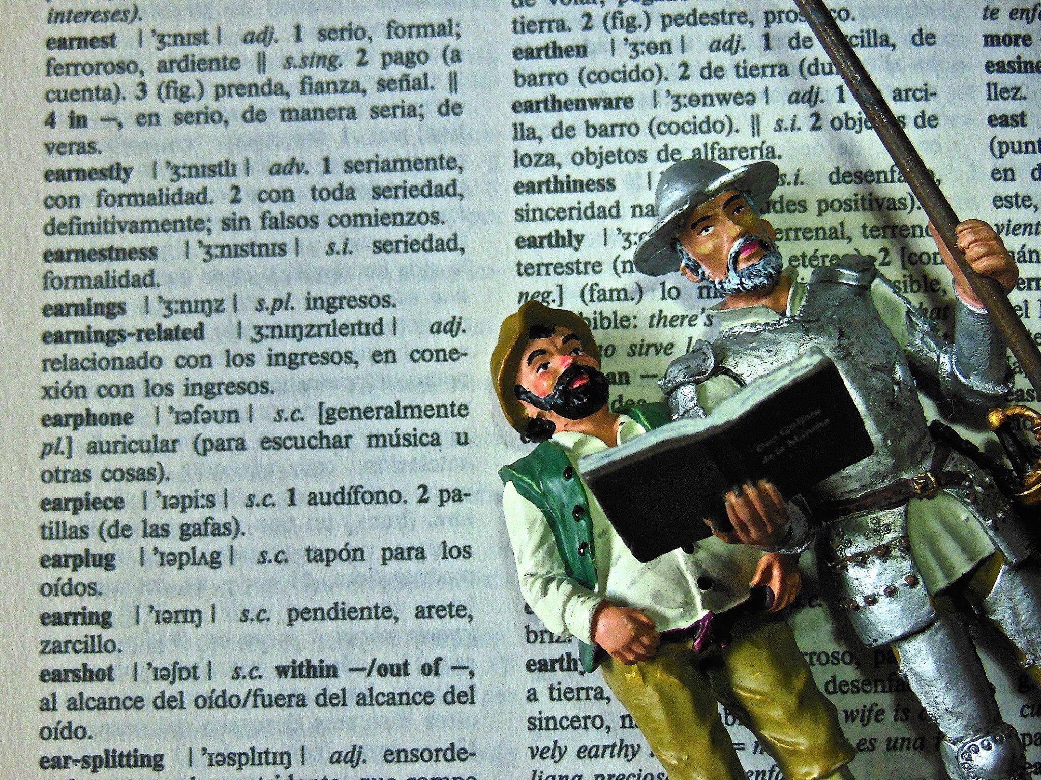 --Siento el call to action; porque ves allí, amigo Sancho Panza, donde se descubren treinta o más desaforados gigantes, con quien pienso hacer batalla y quitarles a todos las vidas pues poseo el know how para ello.