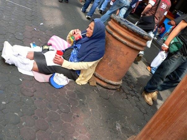 Caso contrario, no estaría sentada sobre el bulevar de la Avenida Central, recostada contra un basurero, abrigada con ropas sencillas ni tomando y comiendo quién sabe qué.