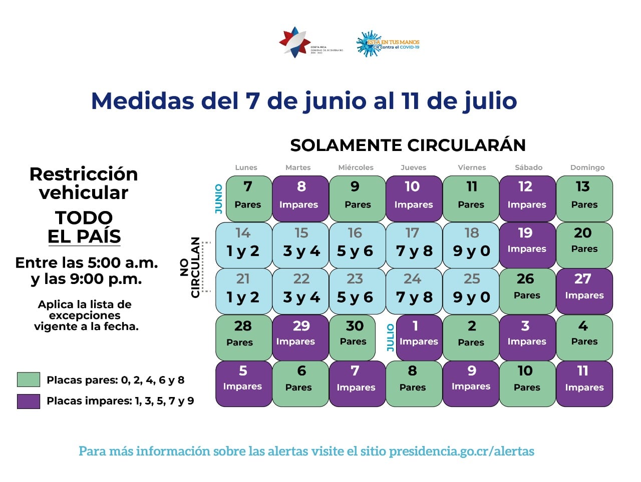 Sin embargo, en las semanas del 14 al 18 de junio y del 21 al 25 de este mismo mes cambiará el esquema y se aplicará la restricción según el último número de la placa, como la que rige en el centro de San José.