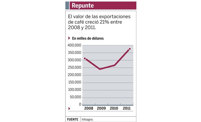Las exportaciones de café oro reportaron una recuperación importante en el 2011. En ese año, las ventas al exterior del grano de oro tuvieron un valor de $373 millones., un 45% más que durante 2010.