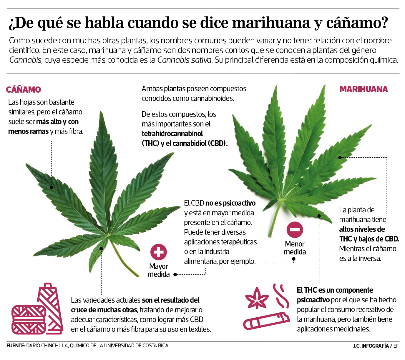 De estos compuestos sobresalen dos que son su principal diferencia y son el centro de la discusión: la marihuana tiene altos contenidos de tetrahidrocannabinol (THC) y bajos niveles de cannabidiol (CBD), mientras que en el cáñamo es a la inversa, es decir, más CBD y menos THC.