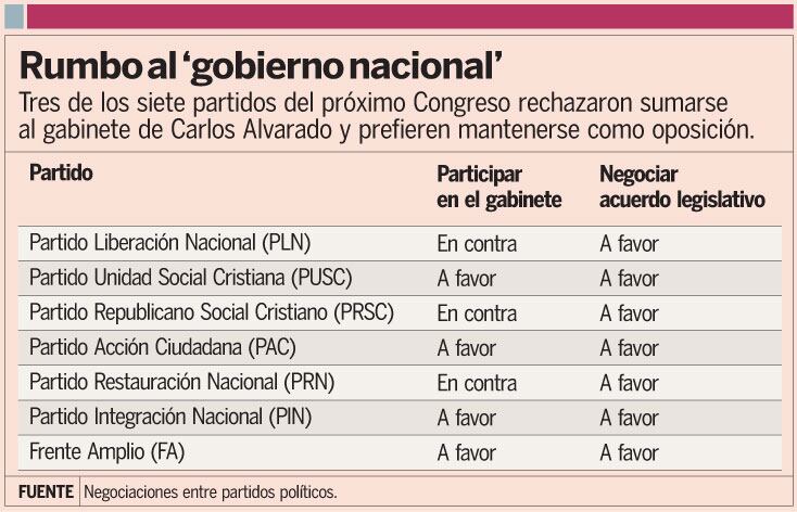 Eso sí, Liberación Nacional, el Republicano Social Cristino y Restauración Nacional se mostraron anuentes a negociar la agenda para el Congreso, pero rechazaron con vehemencia participar en el gabinete del "gobierno nacional" que promueve el Presidente electo.