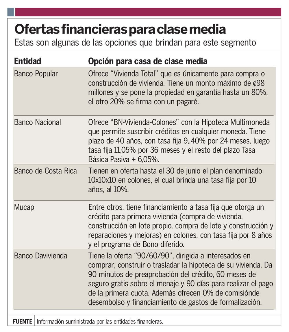 A esto se suma que una familia clasificada dentro del estrato medio tiene ingresos entre cuatro salarios mínimos (¢ 930.228) y diez salarios mínimos (¢2.325.57), según Fuprovi. De acuerdo con los salarios mínimos establecidos por el Ministerio de Trabajo, inclusive uniendo dos salarios mínimos de personas con un grado de licenciatura (¢ 583.633 cada uno) no se podría optar por un crédito para casa en ese rango.