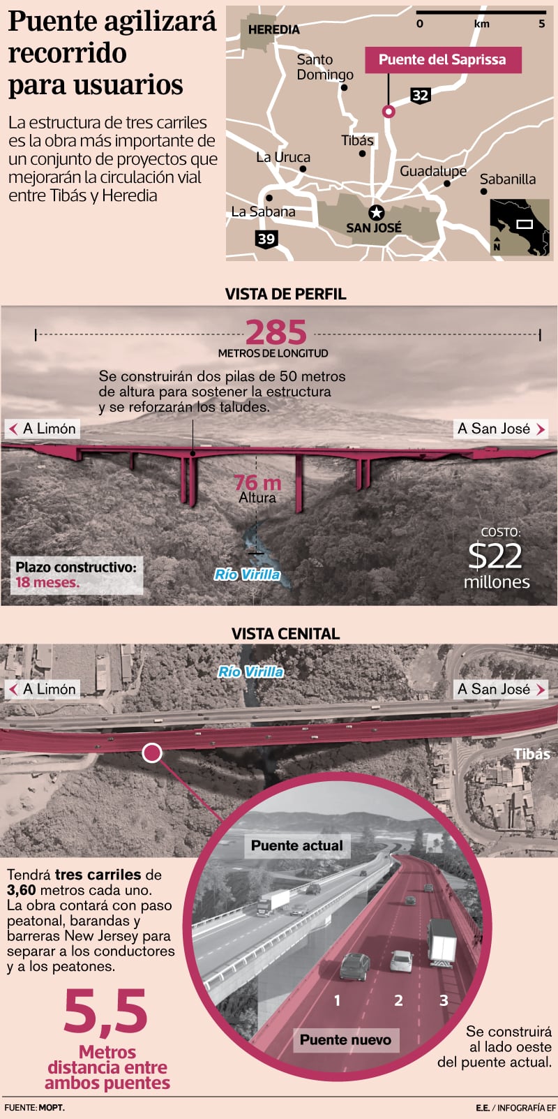 Desde marzo, la obra se construye al costado oeste del puente actual. La infraestructura tendrá tres carriles que se sumarán a los dos existentes para aliviar a los conductores provenientes de Santo Tomás, San Luis, Santo Domingo, San Isidro y San Rafael de Heredia, así como Tibás.