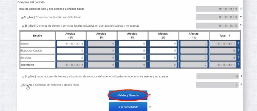 Al final de la tabla se debe marcar Sí o No la opción Créditos fiscales aplicables por transacciones destinadas indistintamente a operaciones sin derecho y con derecho a crédito de una sola tarifa. En este caso como se realizaron compras al 13%, se marca No. Después se debe Validar.