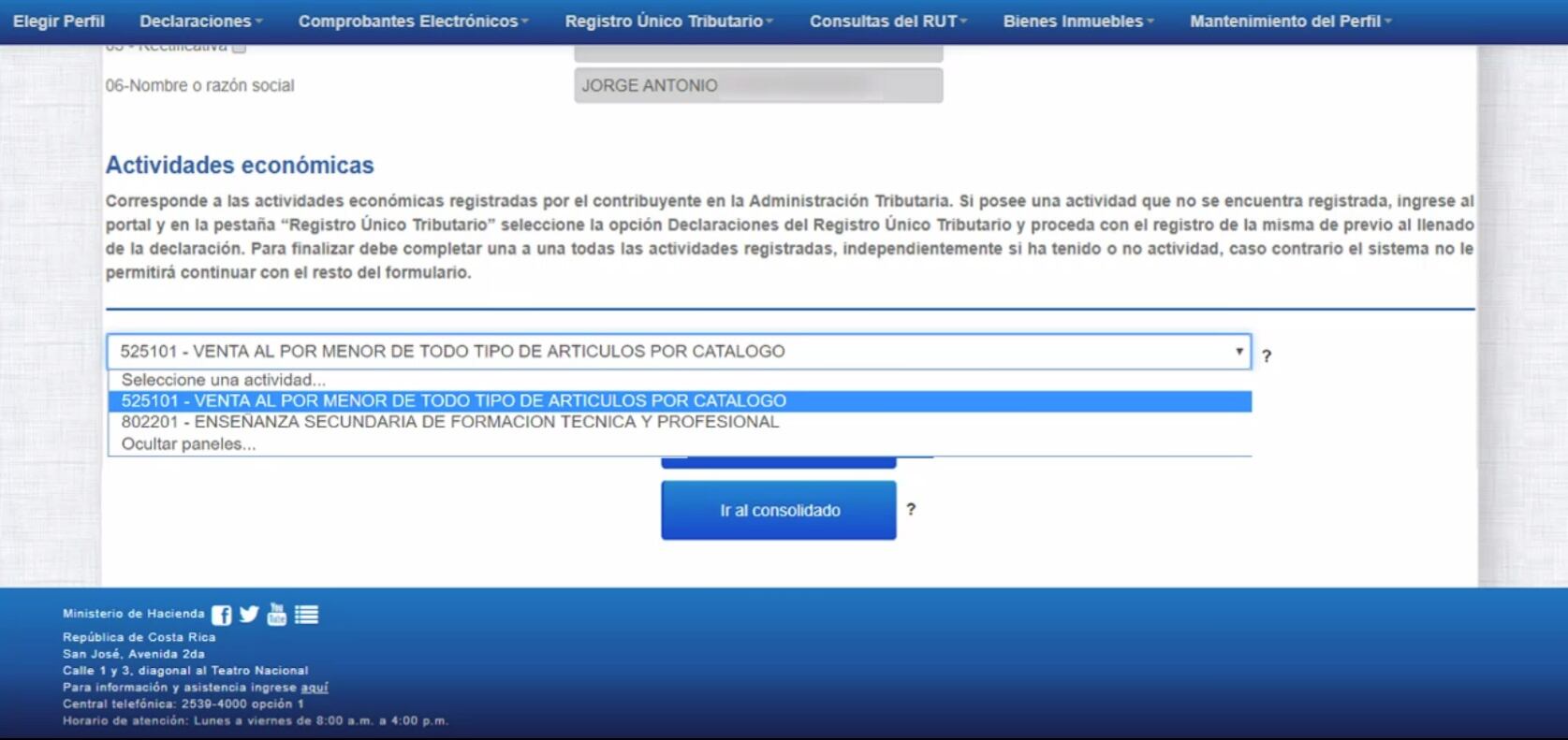 6. Si el contribuyente no tiene otra actividad económica que declarar, debe elegir la opción Ir al consolidado. Si necesita suspender el proceso debe Validar y Guardar para salvar la información registrada.