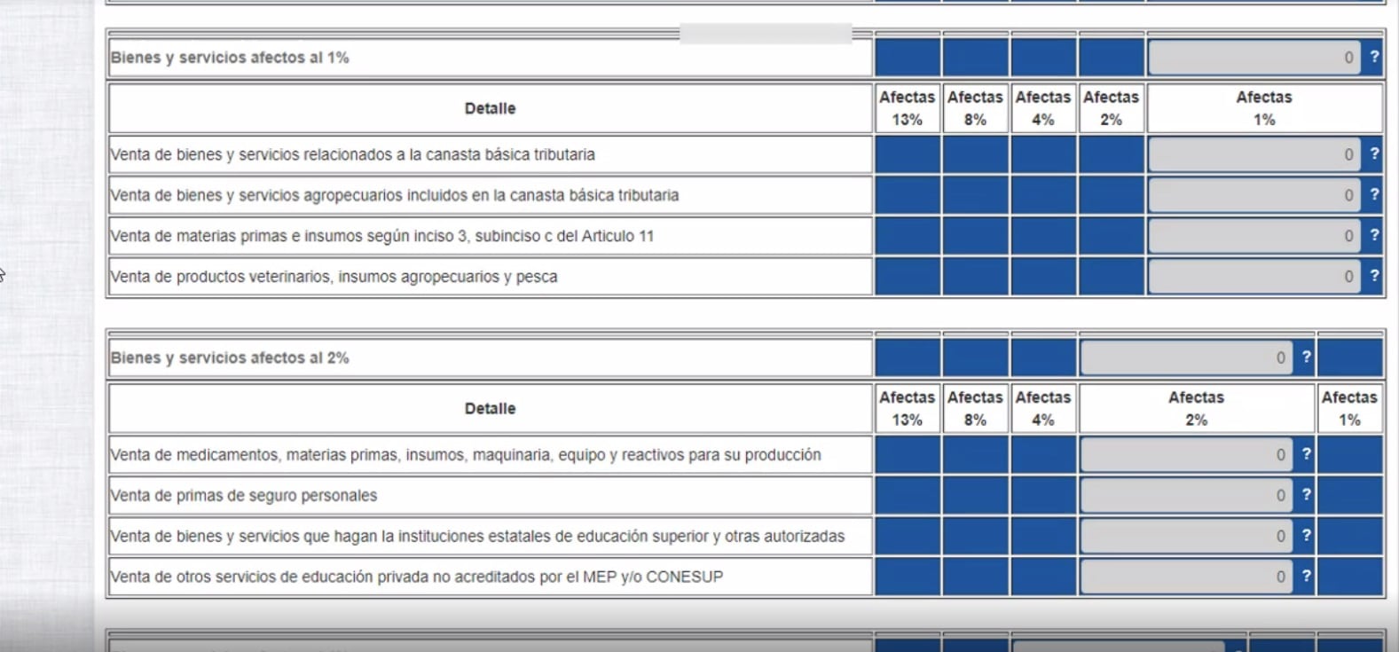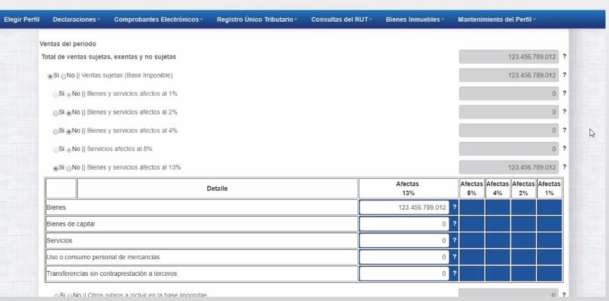 Si las compras y ventas que hace el contribuyente pagan el 13%, se debe marcar la opción Sí en Ventas Sujetas (Base imponible). Una vez señalado, la plataforma muestra diferentes opciones de IVA (1%, 2%, 4%, 8% y 13%).
