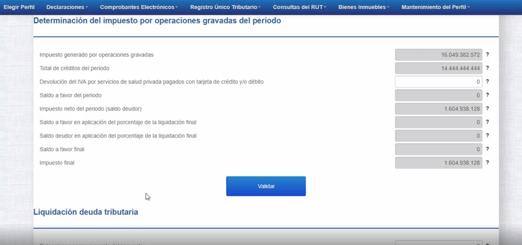 8. Una vez que se valida, en la sección Impuesto por ventas y transacciones sujetas, se muestra el cálculo de los impuestos que el contribuyente cobró por las ventas o servicios que prestó. Luego que se muestra la cifra, se debe hacer click en Validar.