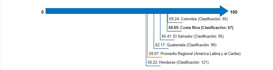 Costa Rica alcanzó una puntuación global de 68,89 si se analiza con el indicador Distancia a Frontera, que permite observar la brecha entre el desempeño de una economía en particular y el mejor desempeño a nivel global.