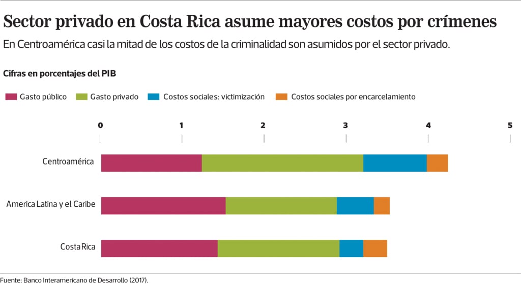 Centroamérica es una de las regiones donde el temor de los hogares y las empresas a la criminalidad provoca que el sector privado gaste mucho más de lo que que invierten sus propios gobiernos en prevenirla y juzgarla (63%). El promedio está afectado por las altas tasas de crimen en países como Honduras y El Salvador, pero el fenómeno también se replica en Costa Rica.