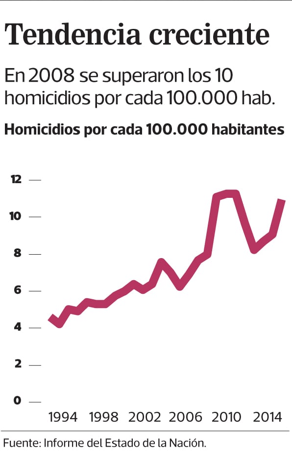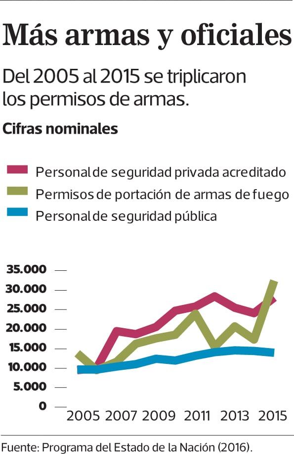 Esa inversión en seguridad no viene en caída: el Estado de la Nación reporta que entre el 2005 y el 2015 el personal de seguridad acreditado en el país se triplicó, la cantidad de permisos para la portación de armas de fuego se duplicó y el personal de seguridad pública aumentó 1,4 veces.