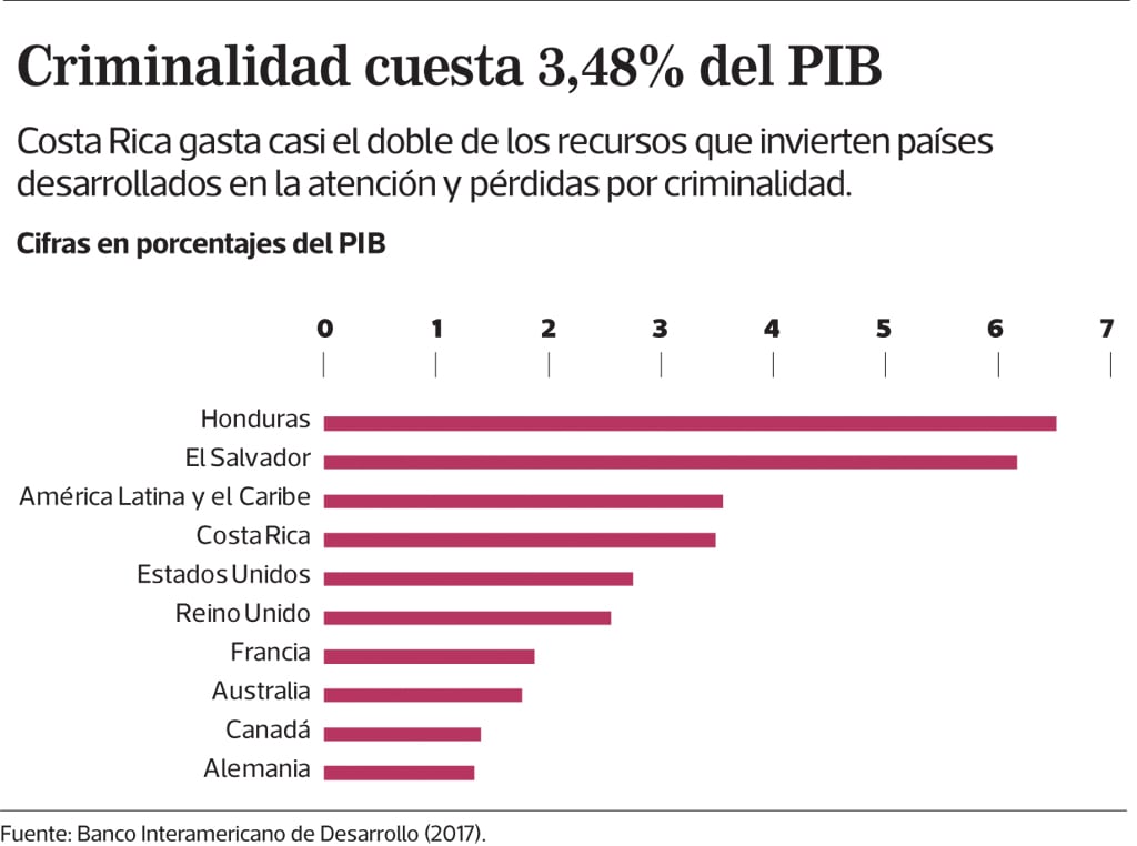 La criminalidad cuesta a Costa Rica un aproximado de 3,48% del Producto Interno Bruto (PIB): casi el doble de lo que representa para Canadá, Alemania, Francia o Reino Unido.