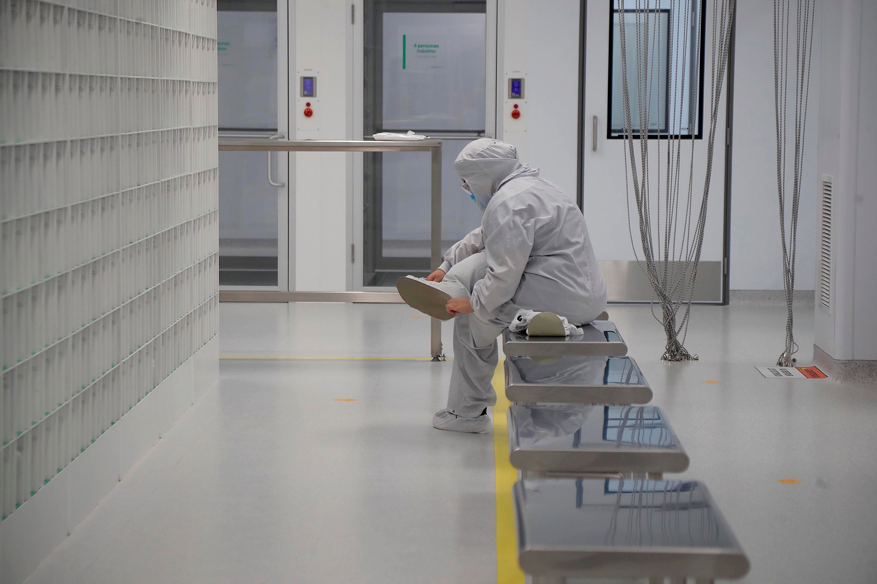 Llegamos a un punto intermedio entre el área controlada y la zona externa. Es un recinto igualmente blanco con estantes tipo zapateras a los lados. Acuña advierte que hay una línea amarilla en el suelo que no se puede cruzar sin antes colocarse el equipo requerido: protectores de tela suave para el pelo y los zapatos, en mi caso también uno para la barba.