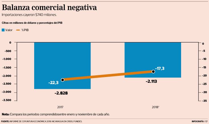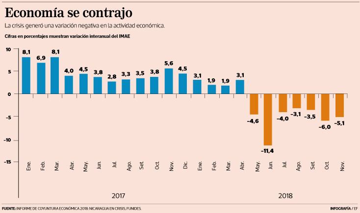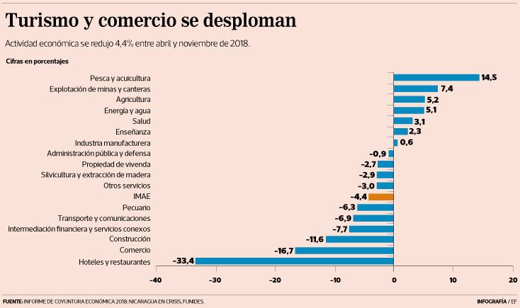 Entre enero y noviembre del 2018, la actividad económica de Nicaragua registró una caída de -4,4% en comparación con el mismo periodo del 2017, los sectores más golpeados fueron los hoteles y restaurantes, el comercio y la construcción, que reportaron reducciones de dos dígitos.