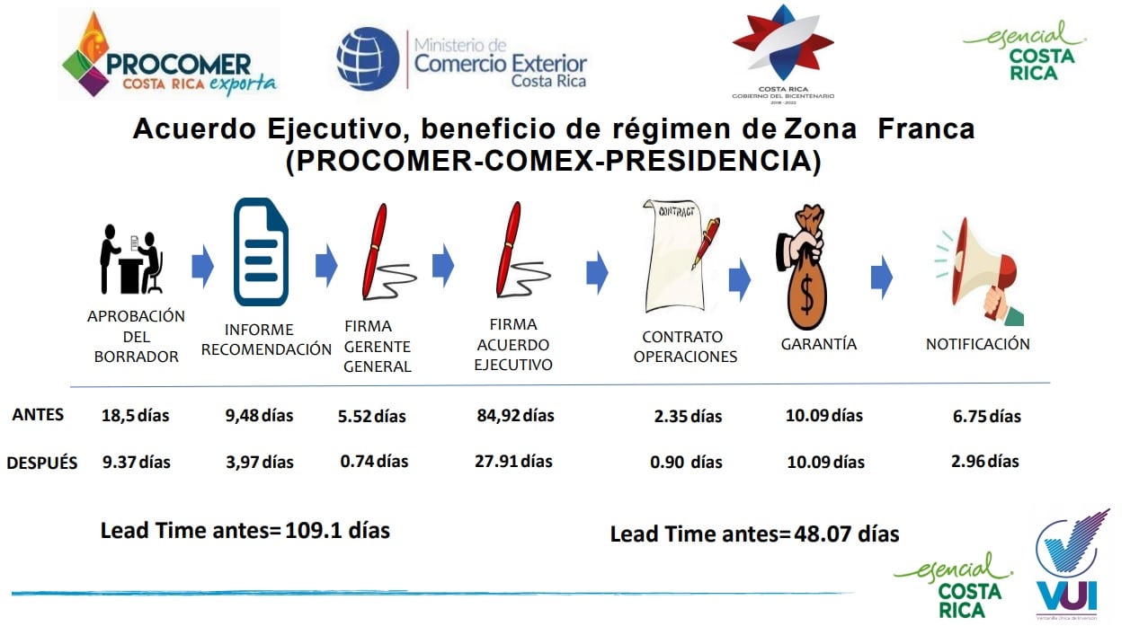 Uno de los procesos que mayor tiempo conlleva es la firma del presidente de la República para otorgar el permiso a las empresas que desean aspirar al Régimen de Zona Franca. Cada año el Mandatario debe de firmar un promedio de 11.000 trámites; Procomer detectó que ese es un importante retraso y como parte del proceso, y en coordinación con la Presidencia, trabaja para dinamizar esas firmas.