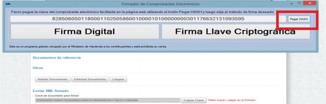 Cuando la clave es copiada, se debe de pegar en el firmador del Ministerio de Hacienda (descargue el firmador en: www.hacienda.go.cr/docs/MHFirmaElectrónica.zip) haciendo uso del botón denominado “Pegar Hash”, para que el comprobante electrónico (XML) pueda ser firmado.