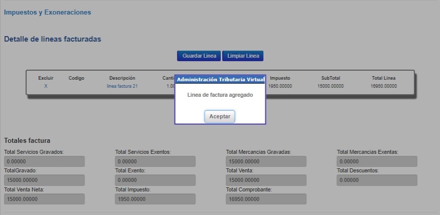 En la opción “Descripción de la Línea” debe de ingresar el detalle del servicio que está vendiendo o realizando. Después, debe dar clic sobre la opción “Guardar línea” y se completará la información “Detalle de líneas facturadas”.