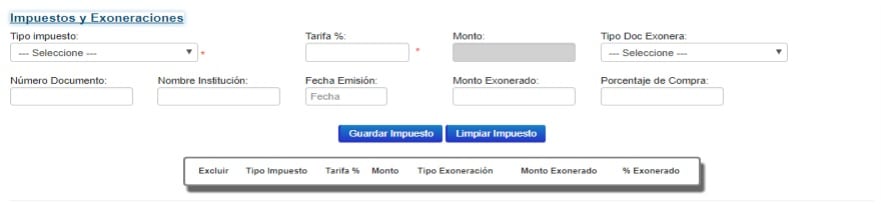 En caso de que el producto o servicio tenga impuesto o esté exonerado, debe de completar la opción “Impuesto y Exoneraciones”, tal y como se observa en la siguiente imagen.